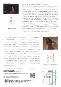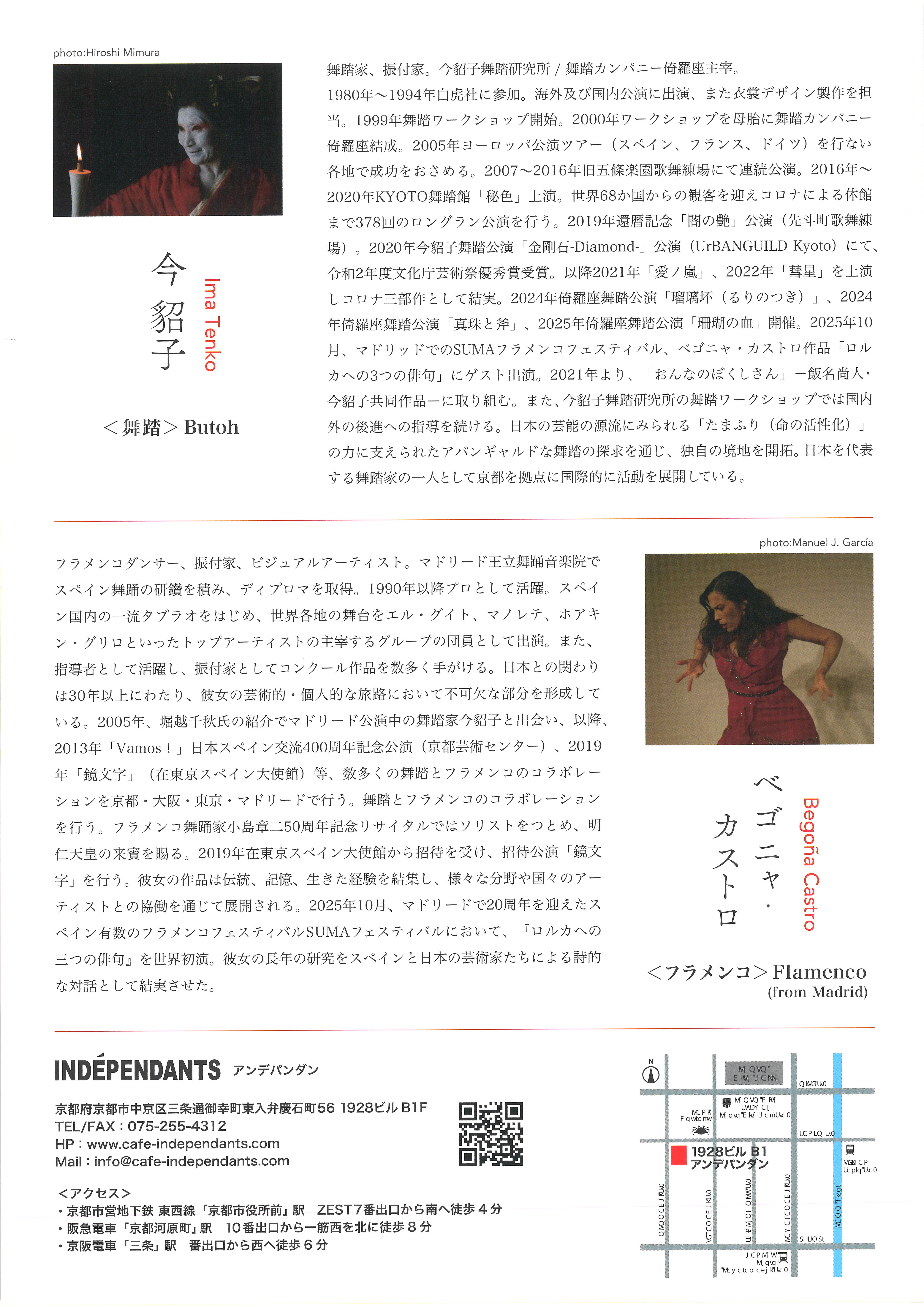日本人の体形、生活様式、風土、文化を根底に肉体の深部から湧き出る感情を表出したものといわれる舞踏とジプシーの喜怒哀楽の音楽や踊りを起源とするjスペインのフラメンコ。それぞれの芸術に打ち込む今貂子(舞踏)とベゴニャ・カストロ(フラメンコ)の芸術交流は、2005年画家・堀越千秋の薦めでマドリードでの今貂子の舞踏をベゴニャ・カストロが目撃したことに始まる。以来、二人は日本とスペインを往還しながら、「大野一雄とラ・アルヘンチーナを讃えて」(2010/UrBANGUILD Kyoto)、「Vamos!」(2014/京都芸術センター)、「鏡文字」(2019/在東京スペイン大使館)など、数多くの作品を発表してきた。アンデパンダンでの「鏡文字」では、東京での初演からのリメークを試みる。